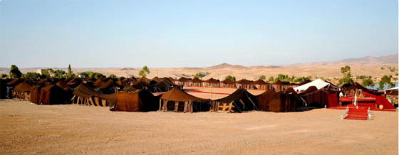 Monté spécialement pour l’occasion, ce campement nomade composé de tentes berbères (en laine noire) sera installé au milieu du désert de Tarhbalt. Le campement est monté en cercle autour d’une vaste place couverte de tapis. Éclairé par des torches et des bougies, il est également décoré par des lumières de couleur. Les participants découvrent alors les tentes dans lesquelles ils vont passer la nuit. Il s’agit de tentes berbères installées comme des petites chambres. Un espace sanitaire commun est également présent, afin de permettre aux participants de prendre une douche (eau chaude). Après avoir déposé leurs affaires, les participants sont invités à un thé d'accueil qui se déroule dans un espace autour du feu. Ensuite, le dîner est servi. Le menu est typique de la cuisine traditionnelle berbère.